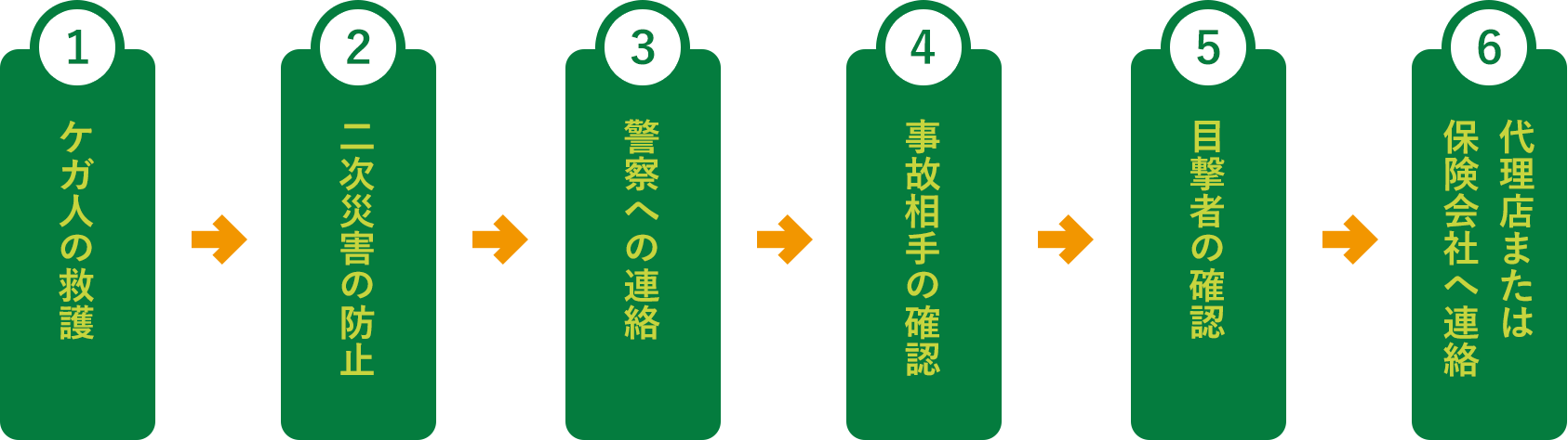 A. まずは事故現場で行う最低限の対応が必要です。その上で、保険会社・保険代理店へ連絡してください。