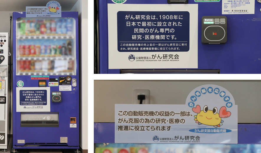 当社の食堂には、「がん研究会支援自販機」を設置しています。この自販機ではソフトドリンクを1本飲むごとに3円が、公益財団法人がん研究会に寄付されます。