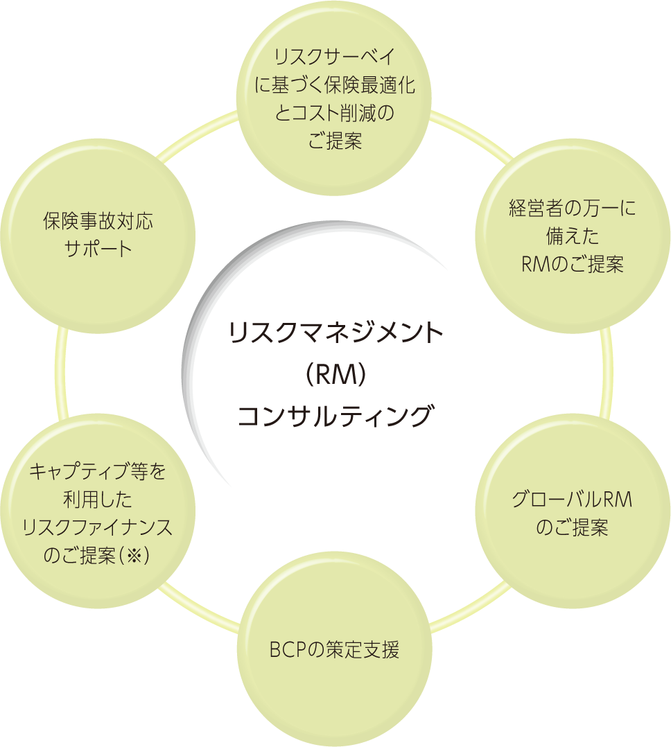 温暖化に伴う気候変動により激甚化し頻発する気象災害、切迫化する巨大地震、すべての世界が繋がりサイバー空間とフィジカル空間が融合していく中で一段と脅威が増すサイバー攻撃等、多様化する企業リスクに対するマネジメントの重要性が従来に増して高まっています。このような中、当社はお客さまとの入念なコミュニケーションのもと、細部にわたりリスクを分析し、評価が容易でないニューリスクを含め定量的、定性的にリスクを把握して最適なリスクファイナンシングをご提案いたします。また、グローバルなリスクマネジメントや、大災害時にレジリエンスを高め事業の早期復旧を図るBCP策定・訓練のご支援、「働き方改革」と「健康経営」に資する労働災害や従業員の就業不能リスクへのサポート等、総合保険コンサルタントならではのトータルなサービスをご提供します。