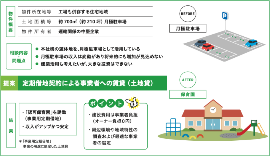 “月極駐車場”から“保育園”へ(業態転換による「土地賃貸」収入アップ)